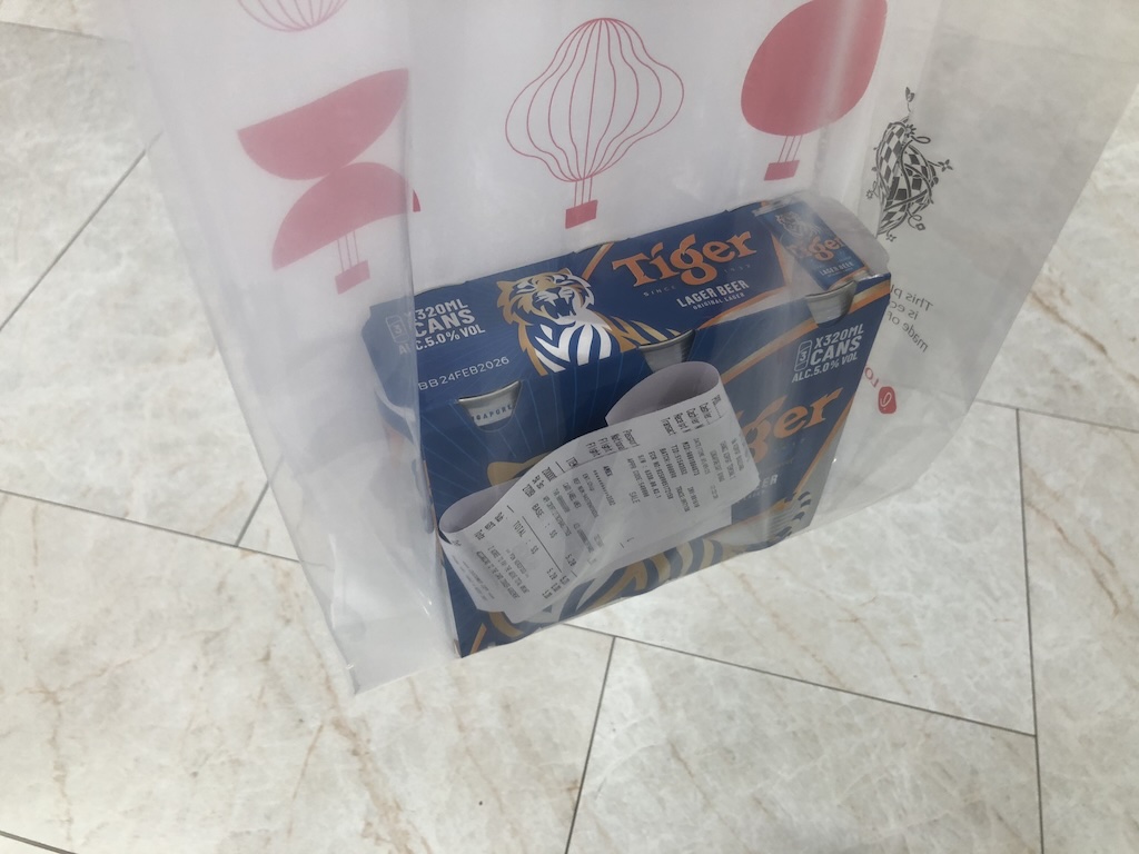 しっかりと免税袋に入れられた状態で,タイガービール3缶パックを購入.$6でした.